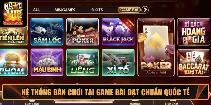 Ngay từ khi bước vào mục game bài, anh em sẽ bị thu hút bởi giao diện sắc nét, không gian thiết kế sống động, hệ thống bàn chơi chuẩn quốc tế. Mỗi ván đấu tại NHATVIP là cuộc so tài mang đậm tính chiến lược. Các trò chơi kinh điển như Liêng, Tá Lả, Bài Tấn, Mậu Binh, Bài Cào đều được xây dựng bằng công nghệ 3D hiện đại. Nhờ vậy hình ảnh luôn sắc nét, âm thanh sống động cùng cảm giác chân thực. Đặc biệt tỷ lệ thưởng cao cùng cơ chế trả lợi nhuận minh bạch giúp bet thủ thu về khoản tiền đáng kể chỉ sau vài ván đấu.